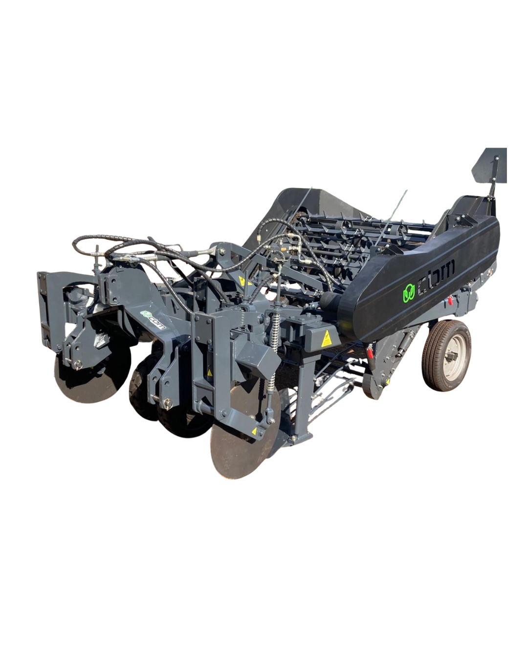 Arranca 02 linhas, desenvolvido para trabalhar em solos irregulares, com sistema hidráulico que permite o controle da velocidade da esteira e dos rolos invertedores.